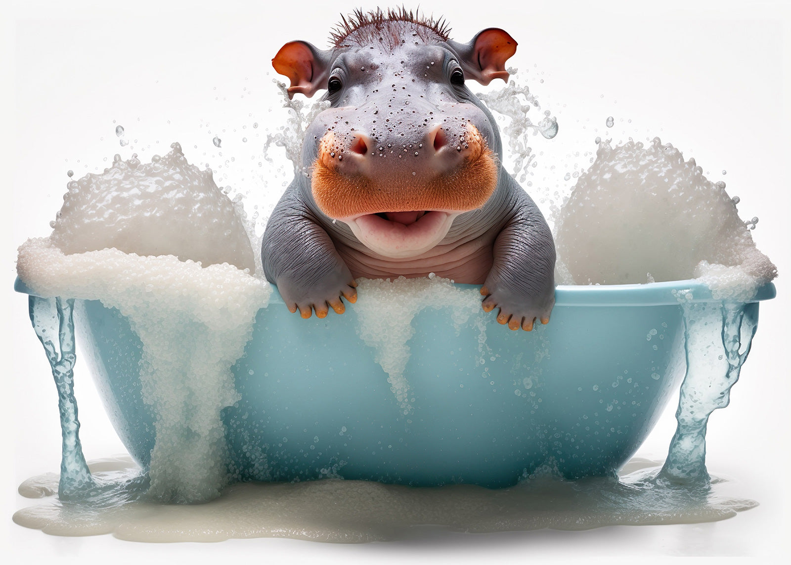 Baby Hippo in Bath Digital Nursery Bedroom Artwork Wall Art Decor Poster Prints